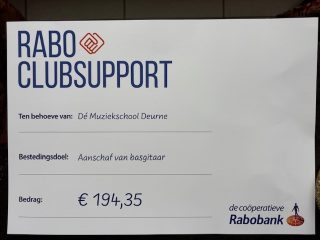 Dé Muziekschool Deurne heeft een bedrag van € 194,35 ontvangen van de Rabobank in het kader van de Rabo Clubsupport actie.